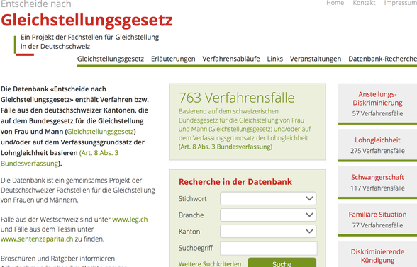 Internet-Dokumentation von Verfahren nach Gleichstellungsgesetz der Deutschschweiz. Es werden Urteile und Vergleiche vor Schlichtungsstellen dokumentiert.